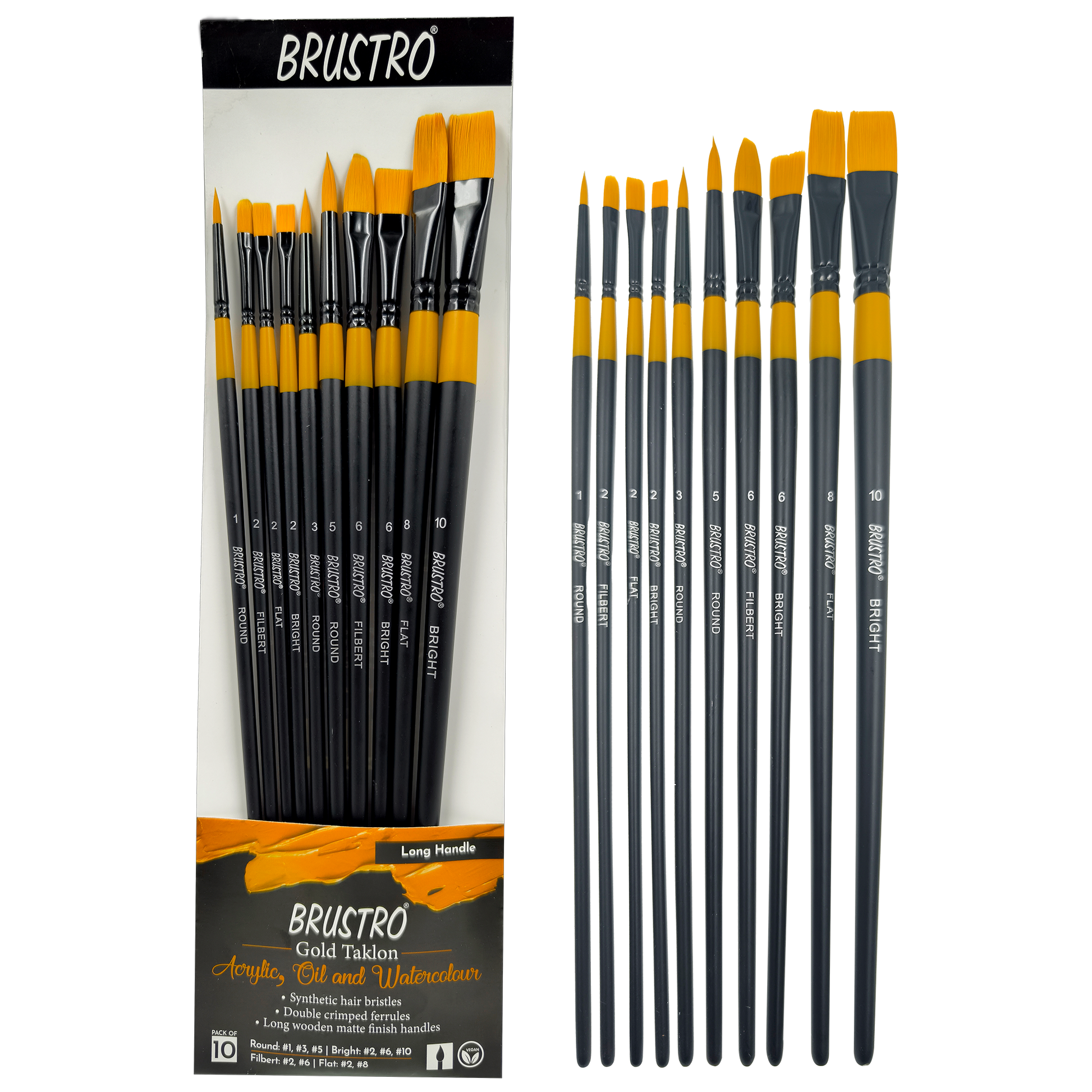 BRUSTRO Artists Gold Taklon Brushes Set of 10| Ideal for Acrylics, Oil paintings, Watercolour | long handle, Bright, Filbert, Flat, Round, Professional Art, School, Office Use.