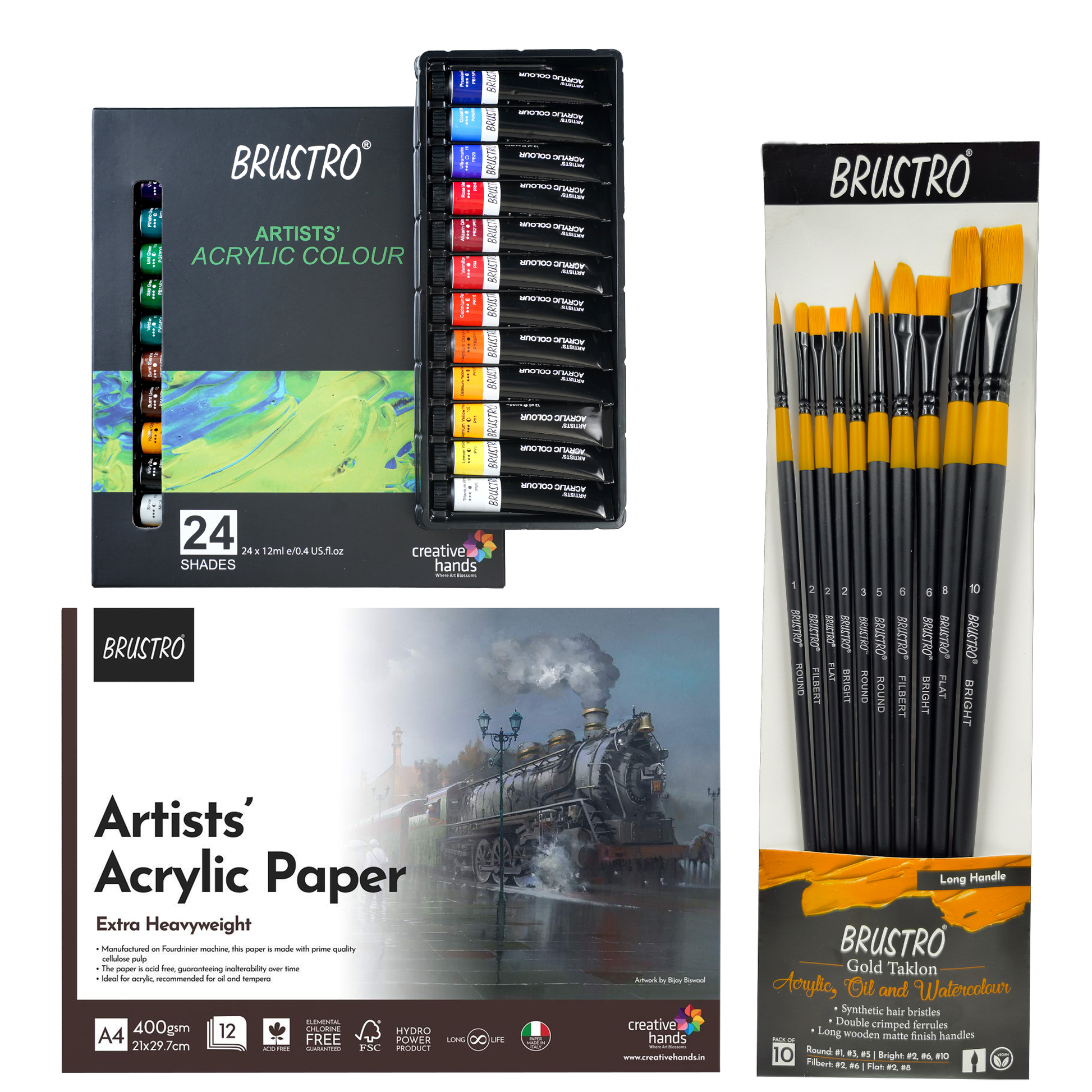 - The synthetic golden taklon range is tailored to the growing entry level market. Suitable for oil and acrylic paints. Includes 10 long handle, synthetic golden taklon brushes in assorted sizes. Suitable for everyone from home use to students and the beginner