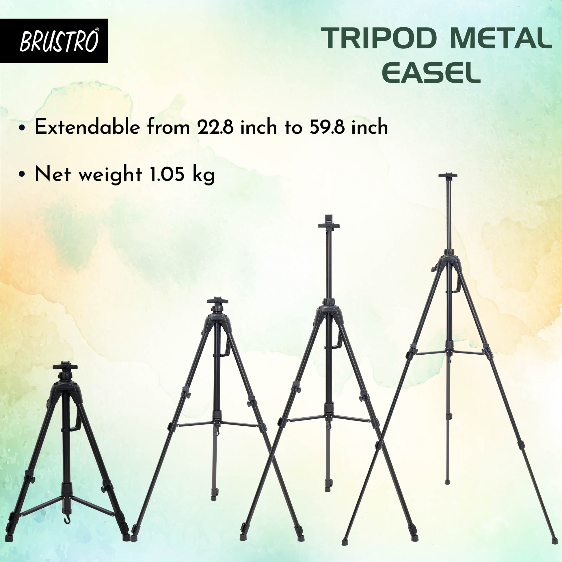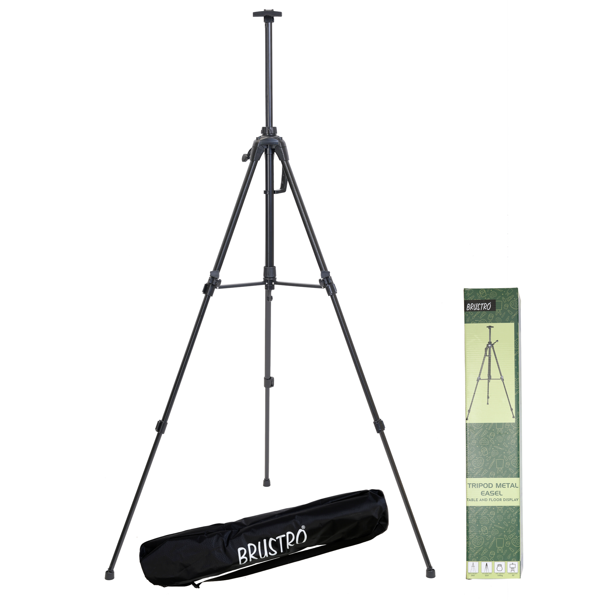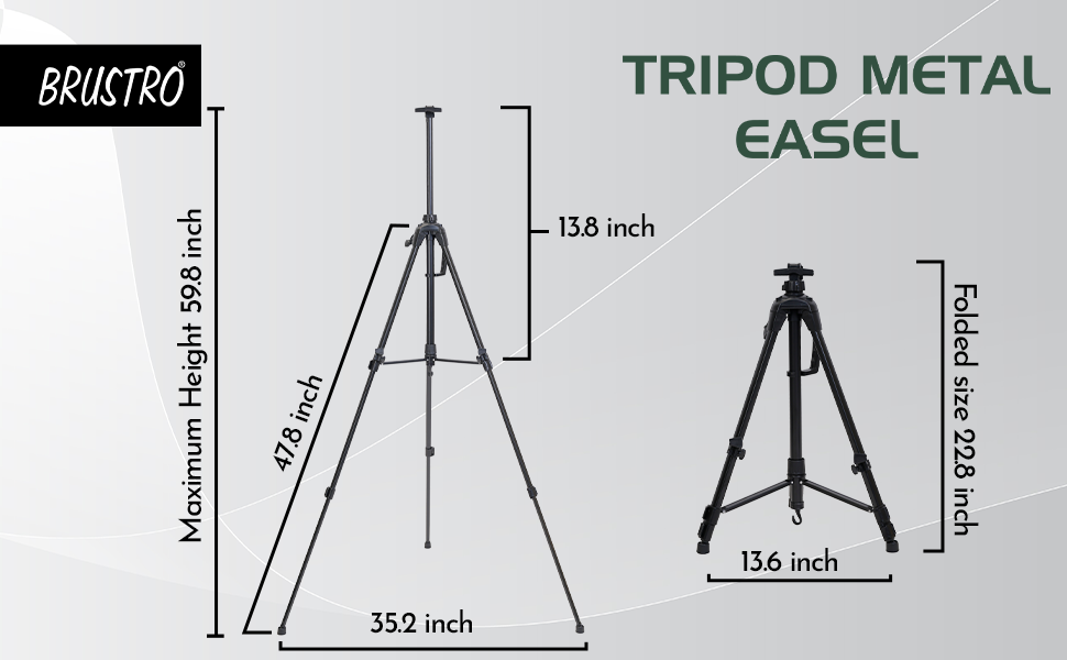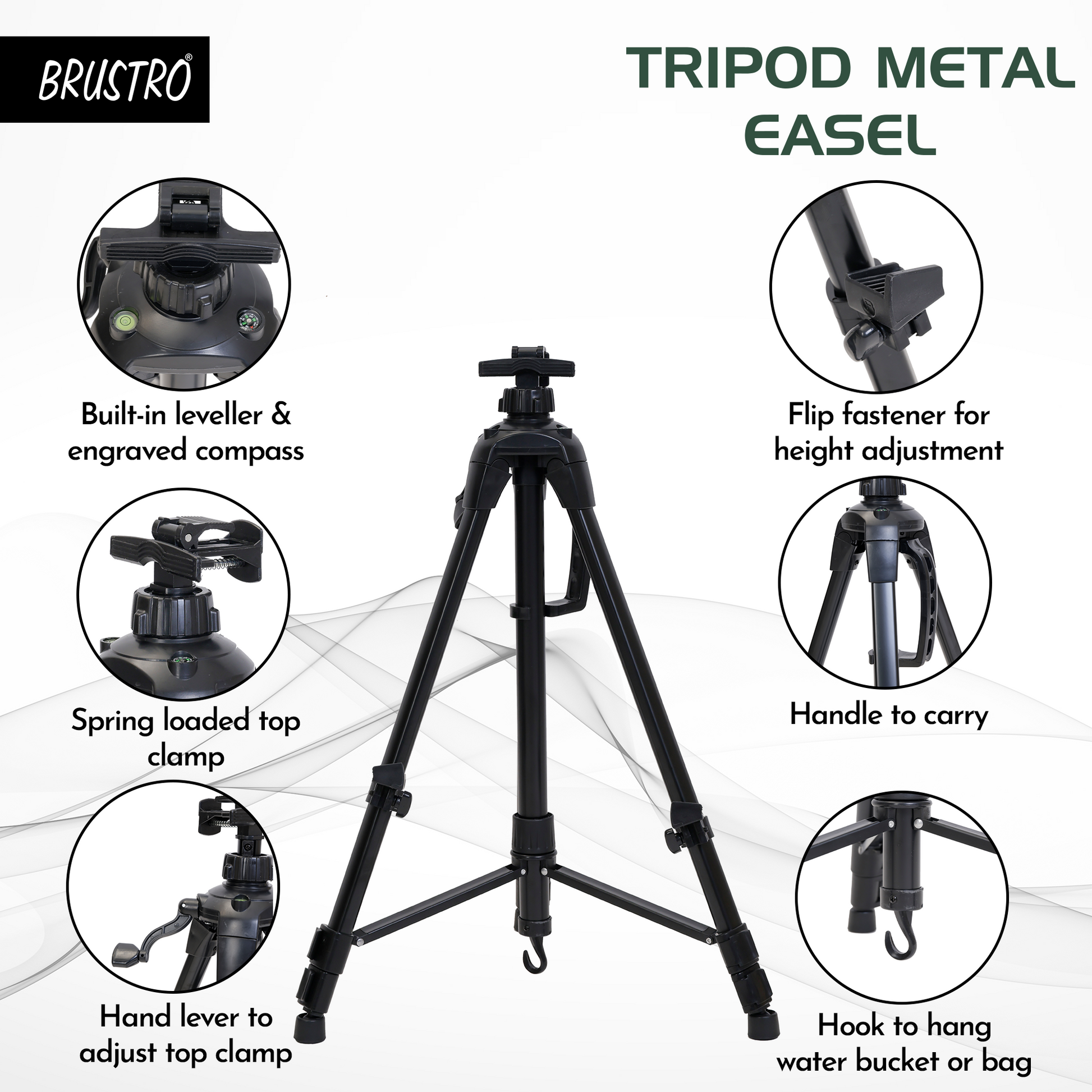 The Brustro Tripod Metal Easel is a high-quality, portable easel designed for both floor and tabletop use. It features adjustable height from 22.8" to 59.8" and supports canvases up to 30". The easel includes a spring-loaded top clamp with a hand lever for easy height adjustment, metal flip fasteners for secure leg length adjustments, an engraved compass to adjust the direction of the art board and a built-in leveller for stability. Weighing only 1.05 kg, it has a handle for easy carrying and a hook for hanging on a backpack or holding a bucket. It also comes with a weatherproof carry bag, ensuring your easel stays protected during transport. Ideal for artists on the go, it combines practicality with durability.