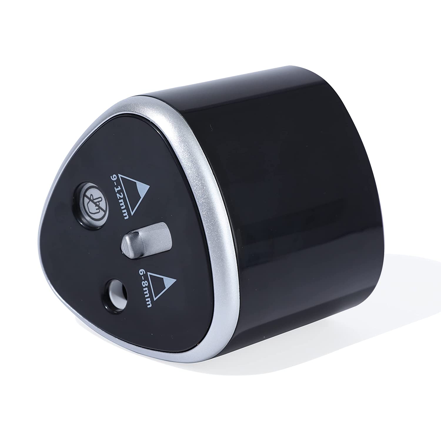 - Automatic Sharpener. Sturdy and aesthetic. Fits pencils with diameter 6-8mm/ 9-12mm.Gives sharp points in seconds. Runs on 4 AA batteries (not included). SK2 blade gives sharp and durable point.2 replaceable blades included. Safety Switch to protect fingers. Large transparent shaving bin. Non -skid rubber feet.