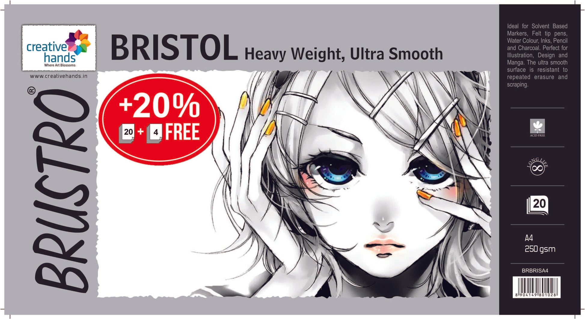 The Brustro Bristol paper features sheets of 250gsm, paper is produced utilising hydroelectric power thus reducing greenhouse gas emissions into the atmosphere. Being an ultra-smooth surface is resistant to repeated erasure and scraping. Ideal for solvent based markers, felt tip pen, watercolour, ink, airbrush, pencil &, charcoal. Perfect for illustration, design and manga. The bright white coloring makes for excellent contrast. Perfect for artists' & amatures. The absence of acid guarantees its inalterability over time. Made in Italy. Available in 3 sizes.