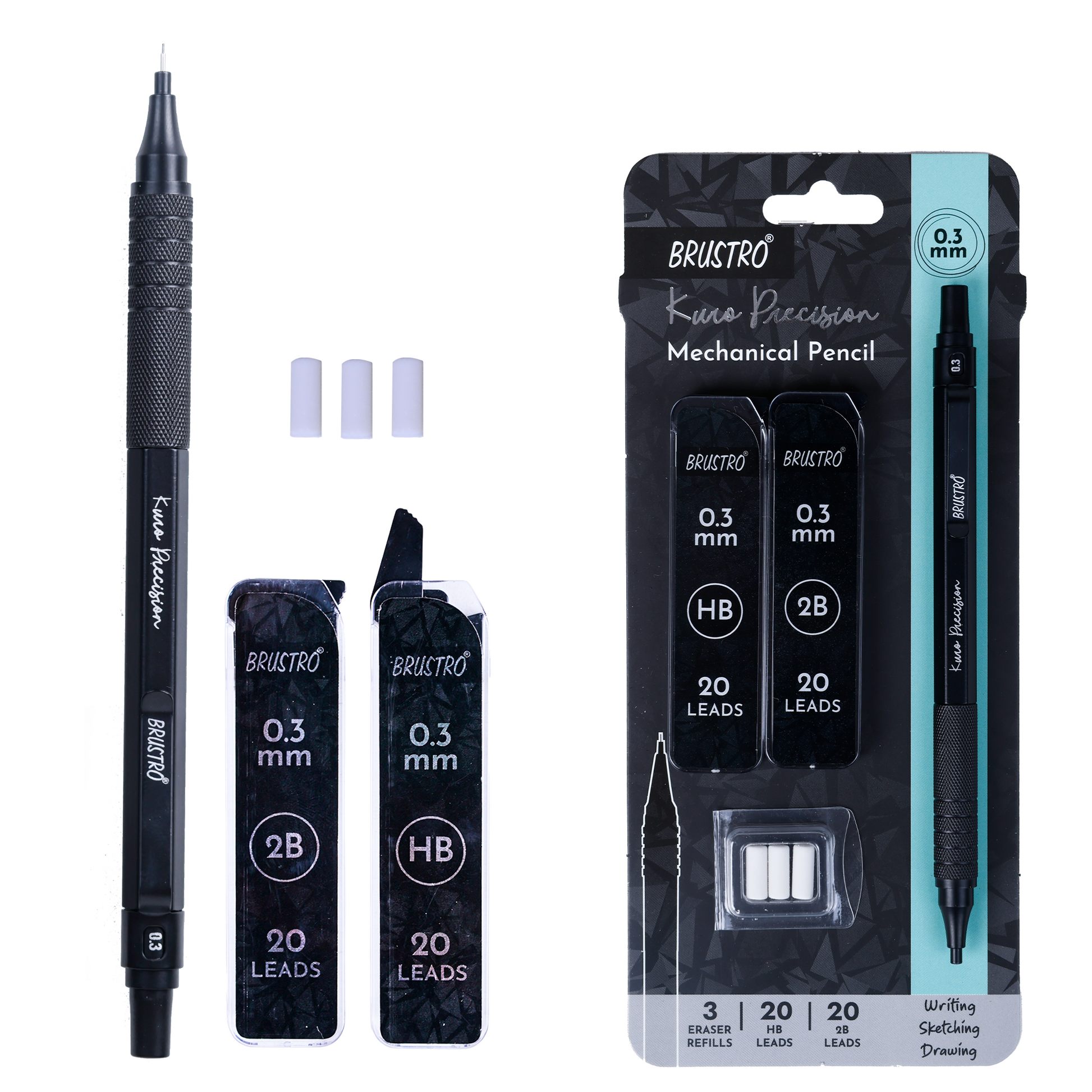 Discover unmatched precision and effortless control in writing and drawing with the Brustro Kuro Precision Mechanical Pencils. Featuring a chic matte black metal body with an embossed logo, these pencils are lightweight and engineered for both comfort and accuracy. The metal grip ensures a steady hand during prolonged use, while the consistent lead flow creates smooth, clean lines every time. The range includes five different sizes (0.3mm, 0.5mm, 0.7mm, 0.9mm, and 2mm), making them ideal for detailed work, general writing or bold sketching. Each pack comes complete with multiple eraser refills and lead refills, so creativity never has to pause.