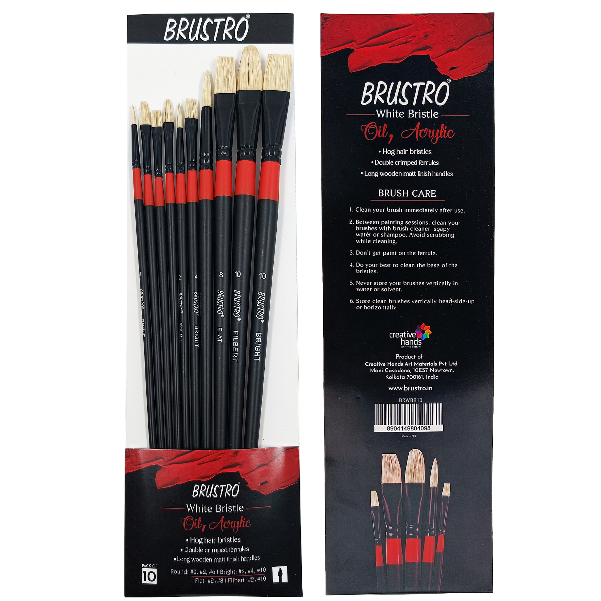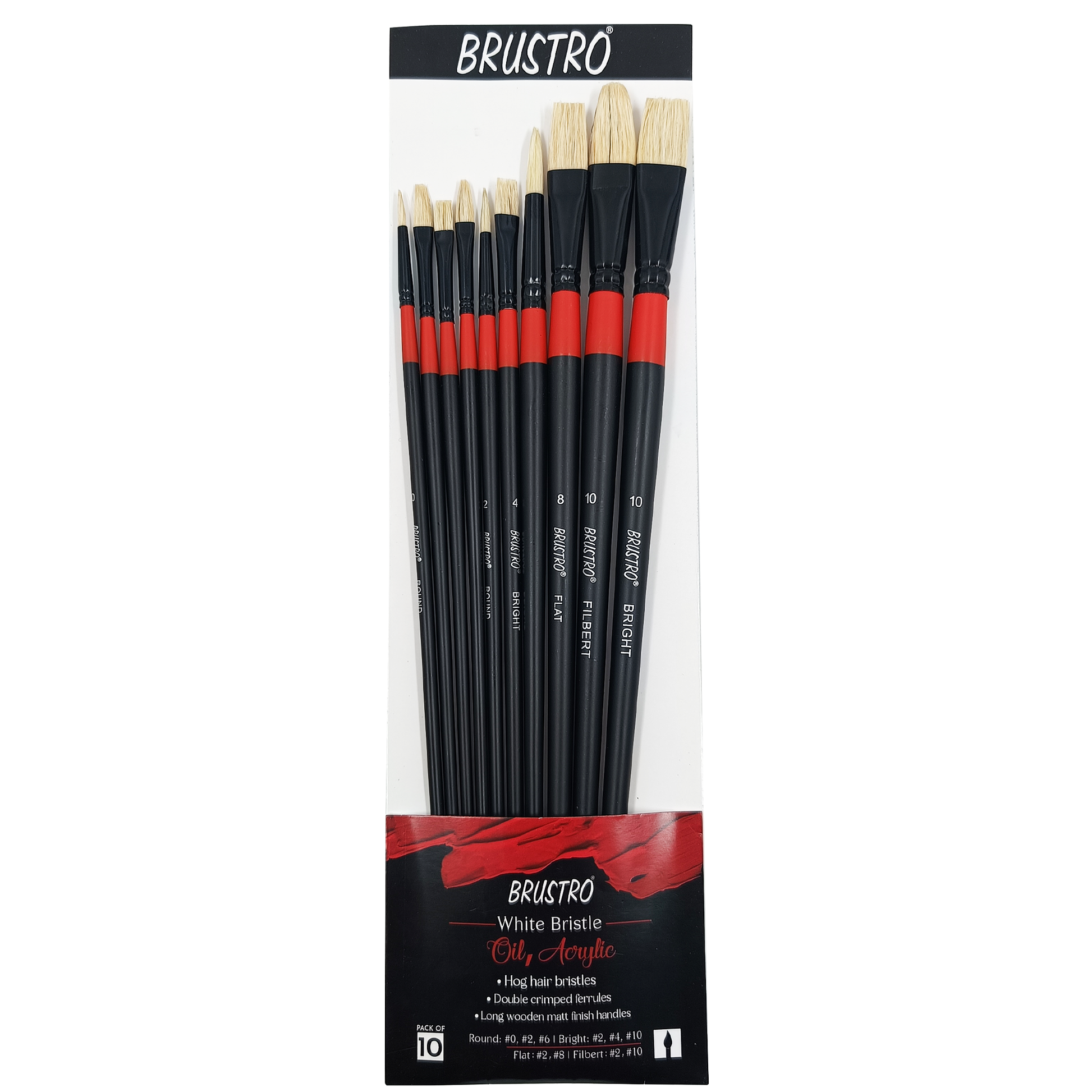 - Includes 10 Long handle, Bristle White brushes in assorted sizes.