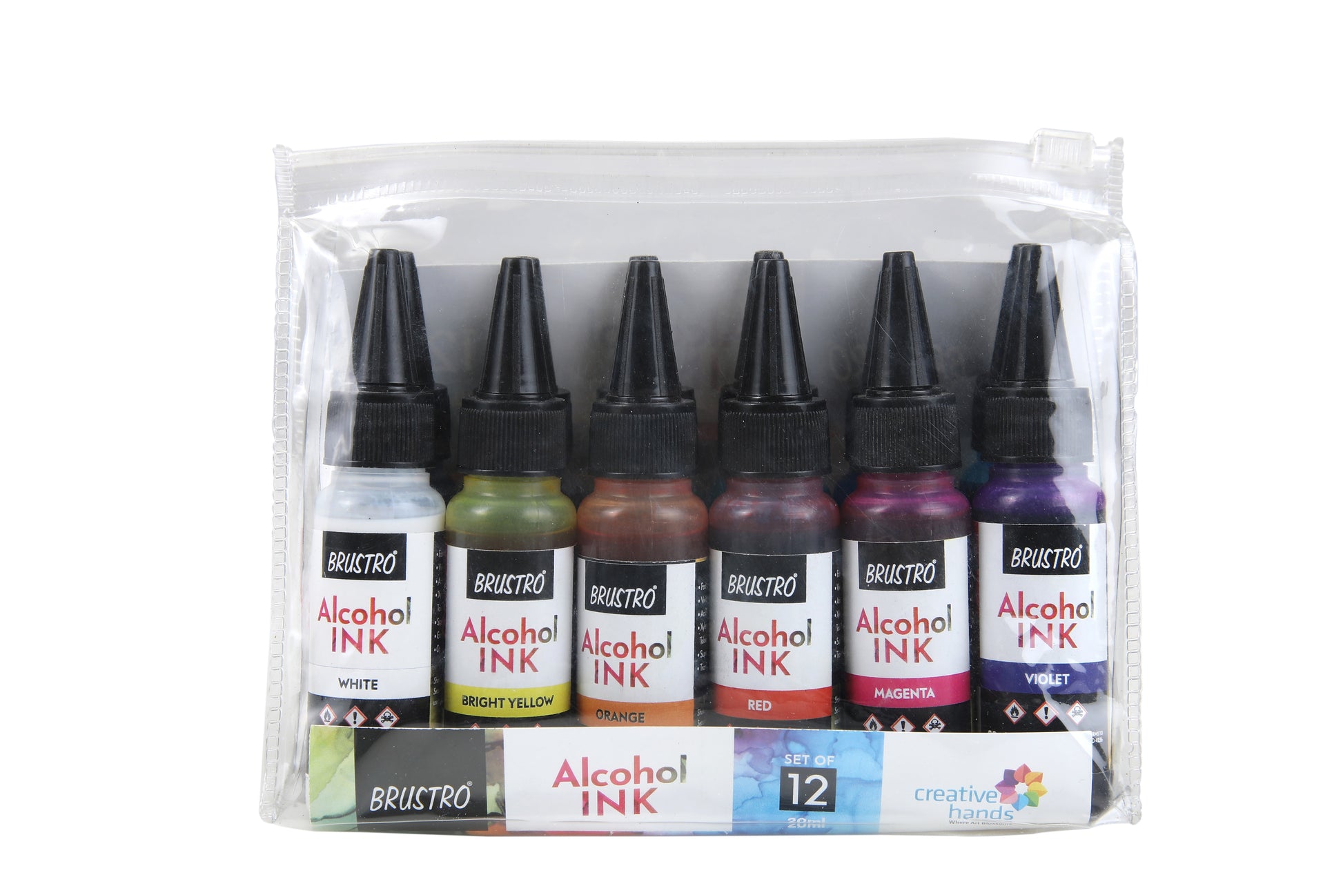 Compatible with epoxy resin and Brustro alcohol ink paper Use spray varnish to secure the artwork. The inks are intermixable which gives the freedom to create new palette of colours. Shades - White, Bright Yellow, Orange, Red, Magenta, Violet, Teal blue, Denim Blue, Sea Green, Bright Green, Brown and Grey.