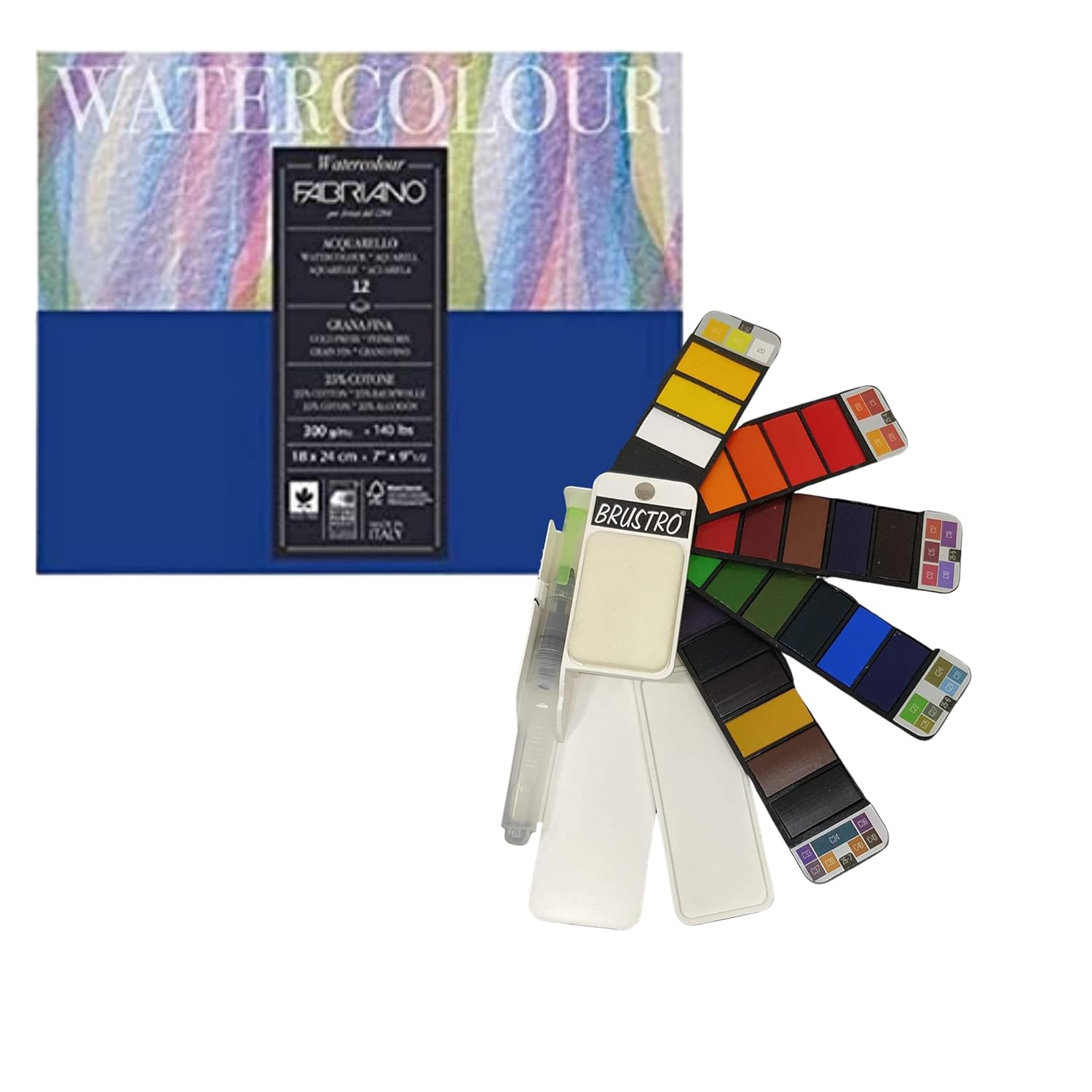 Brustro Artists Watercolour Pan Set of 25 with Fabriano Studio Watercolor Block 18X24cm