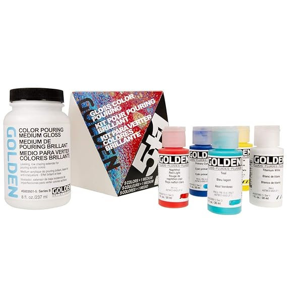 GOLDEN Gloss Pouring Medium Set Create beautiful glossy pours with GOLDEN Color Pouring Medium Gloss, a leveling, low crazing extender for pouring acrylic colors. The set includes an 8 oz. bottle of Colour Pouring Medium Gloss along with 1 oz. Fluid Acrylic Titanium White, Naphthol Red Light, Primary Yellow, Teal and Primary Cyan.