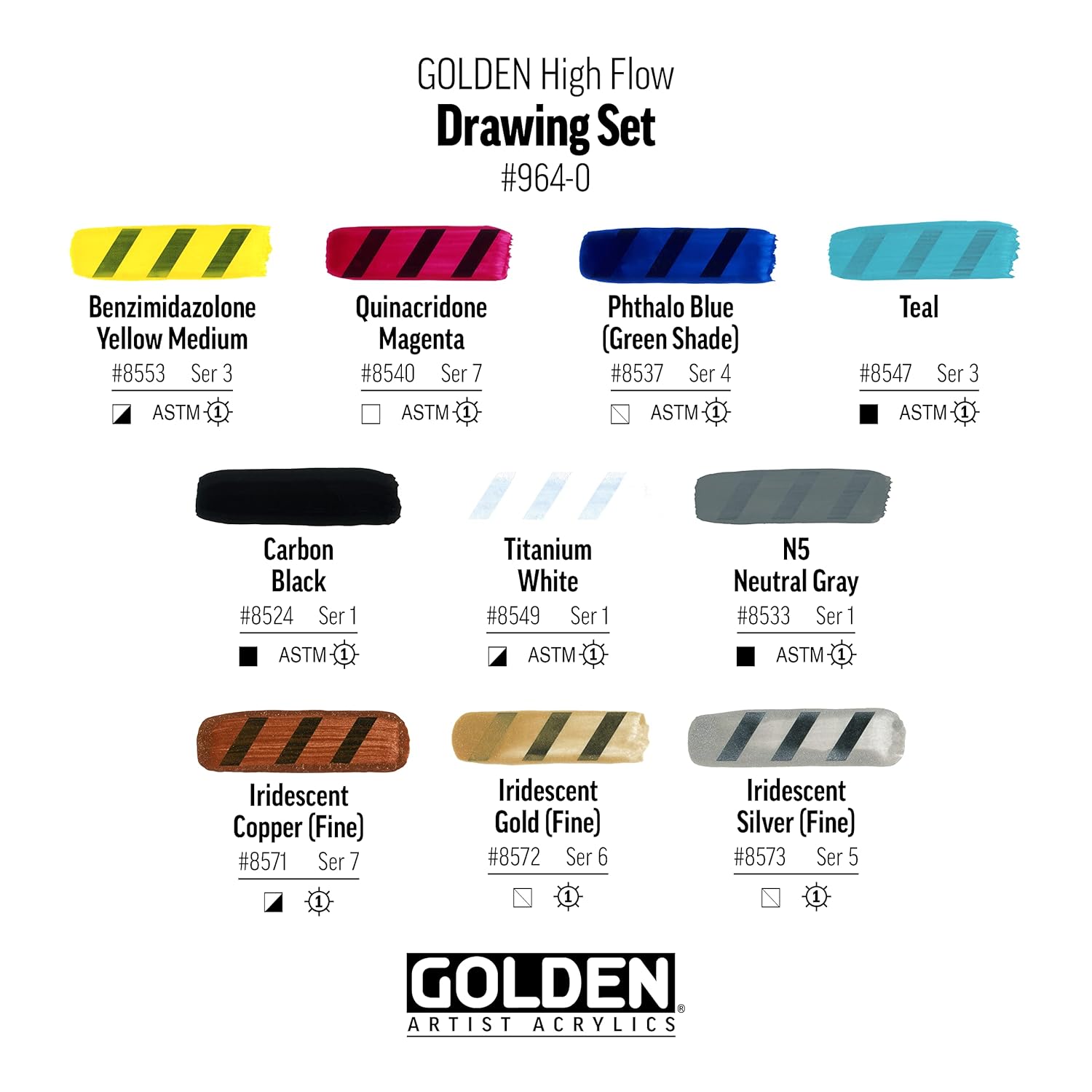 - The High Flow Drawing Set from Golden includes 10 colors for calligraphers, graphic artists, and illustrators.