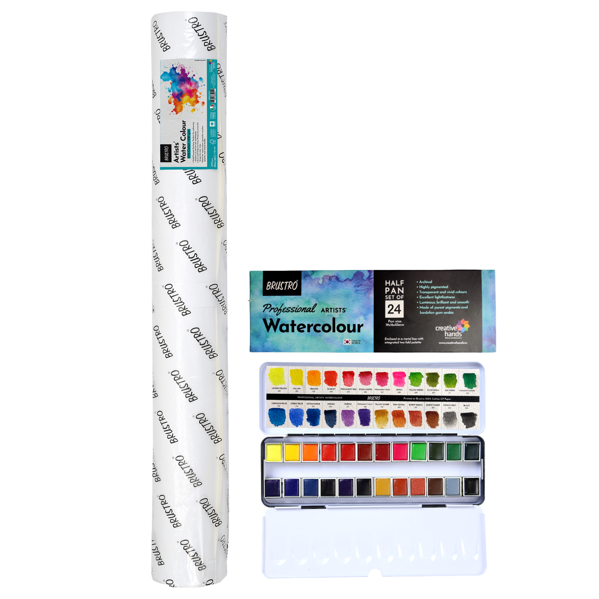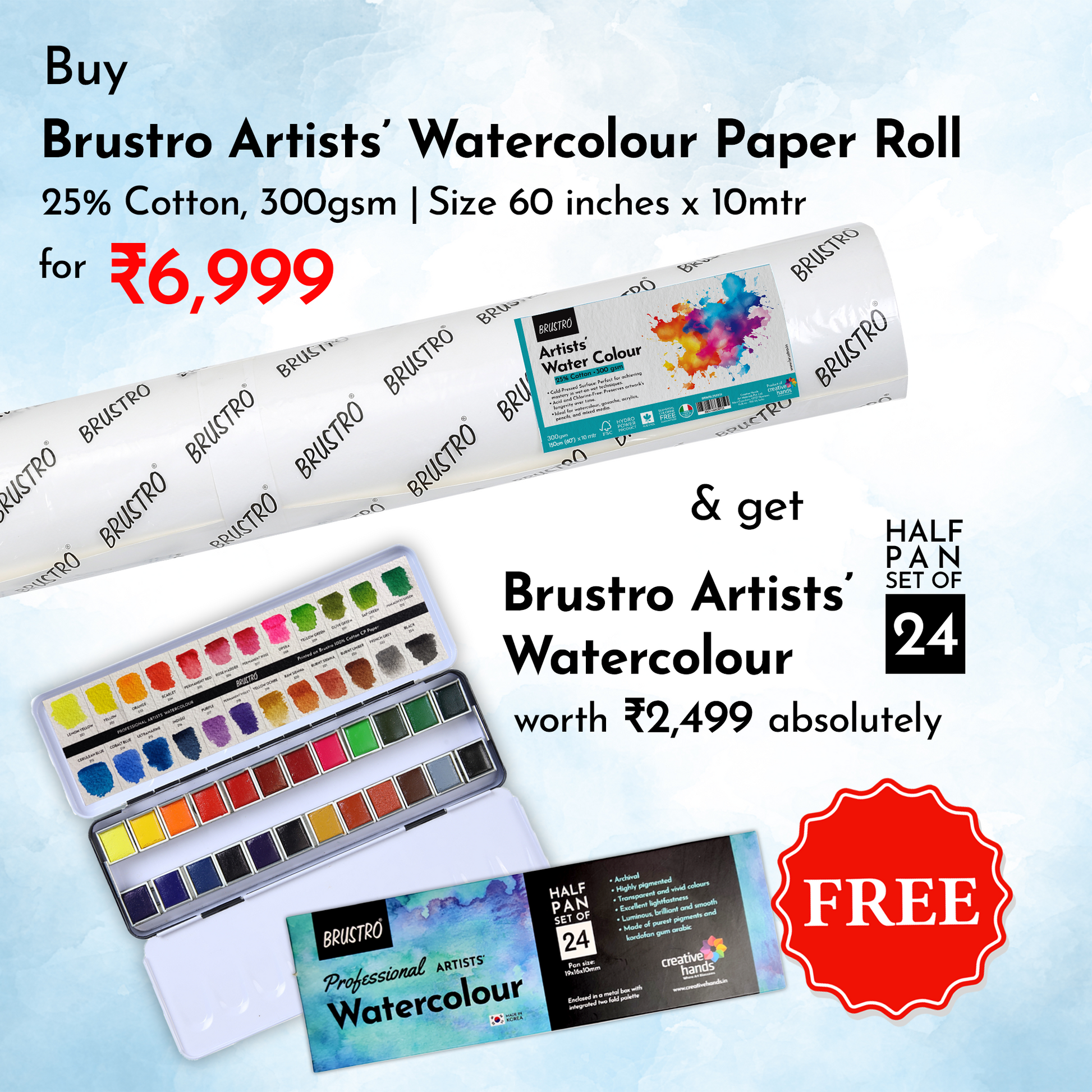 The BRUSTRO Artists Watercolour Paper Roll, a high-quality choice for artists and students alike. Designed with precision and crafted to meet the demands of professional and amateur painters, this watercolour paper boasts a robust 300 GSM thickness and is composed of 25% cotton. The cold-pressed texture ensures excellent absorbency, making it ideal for both dry and wet painting techniques. Whether you are a seasoned artist or just beginning your journey, this Watercolor Paper Roll offers the perfect canvas for your creativity to flourish. From detailed illustrations to expansive washes, BRUSTRO Artists Watercolour Paper delivers exceptional performance and durability, ensuring your artwork stands the test of time.With Free Artist Professional Watercolour Half Pan Set of 24 worth Rs.2499.