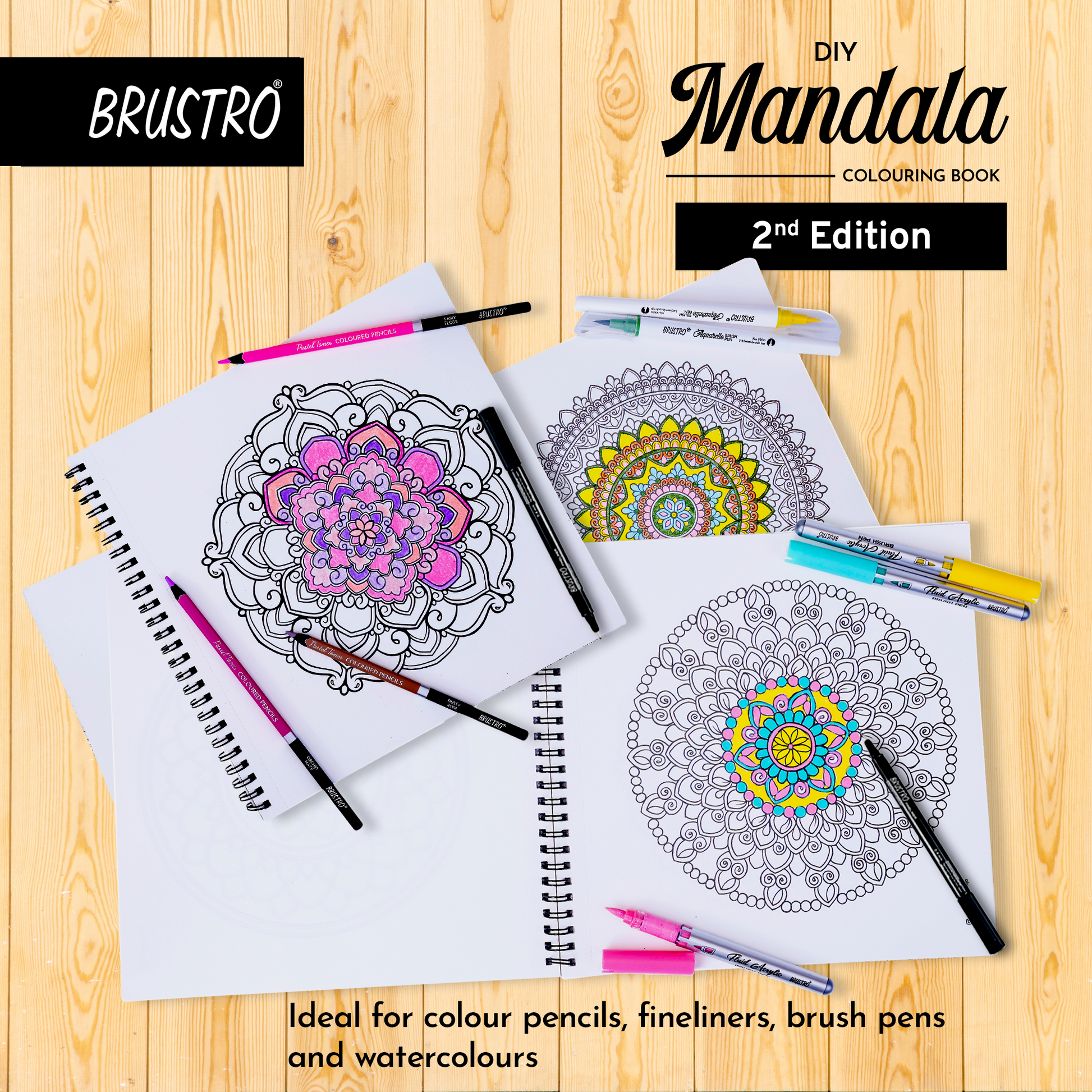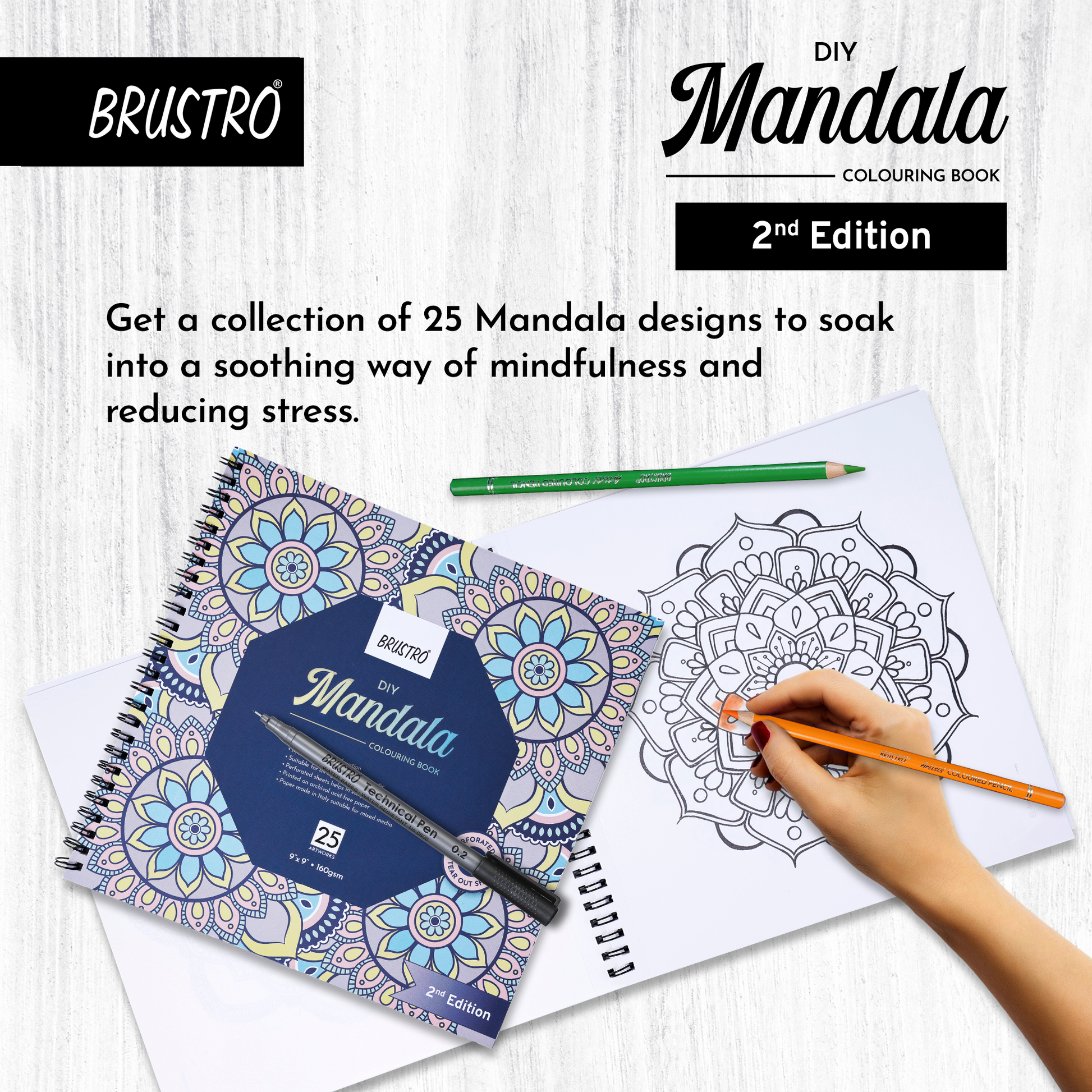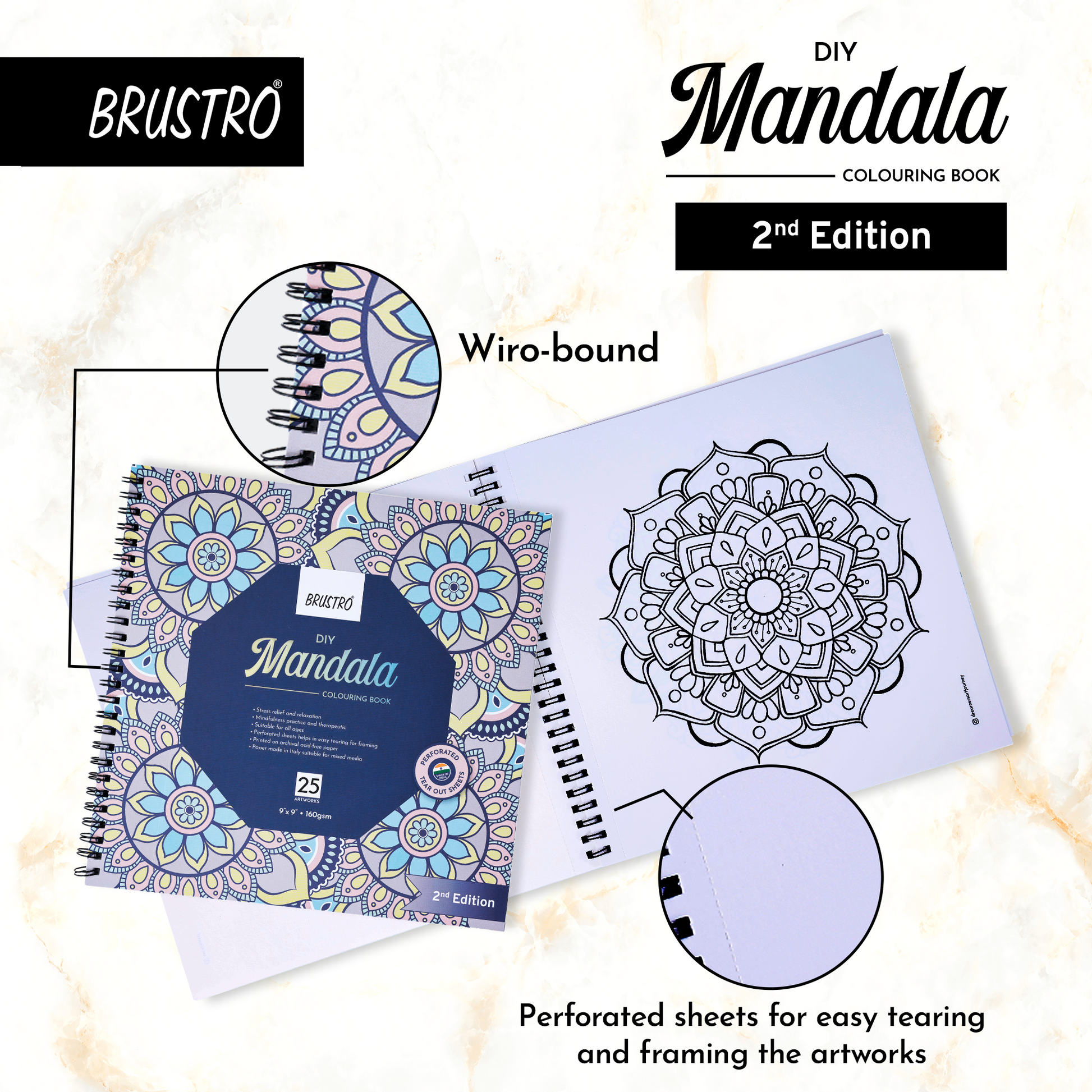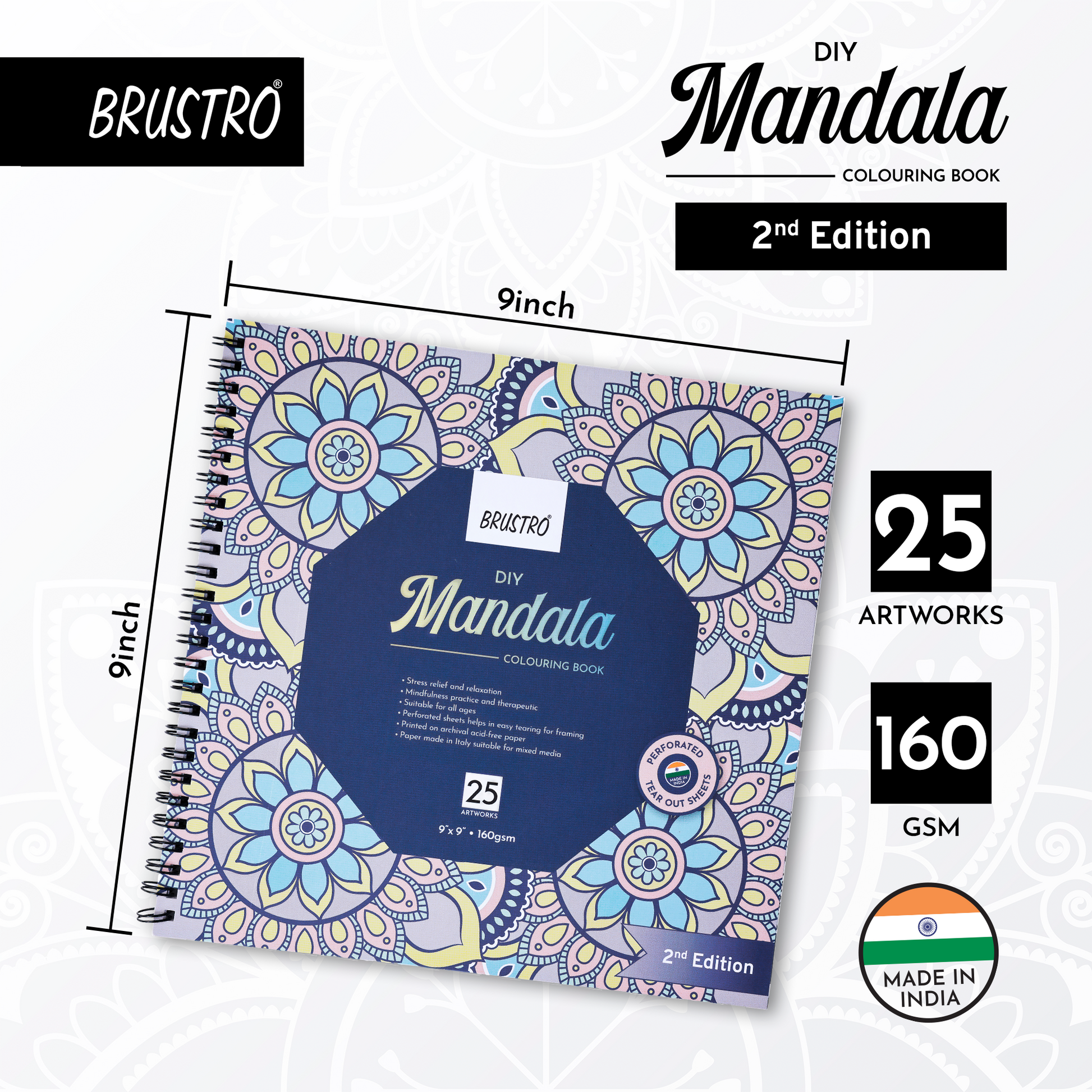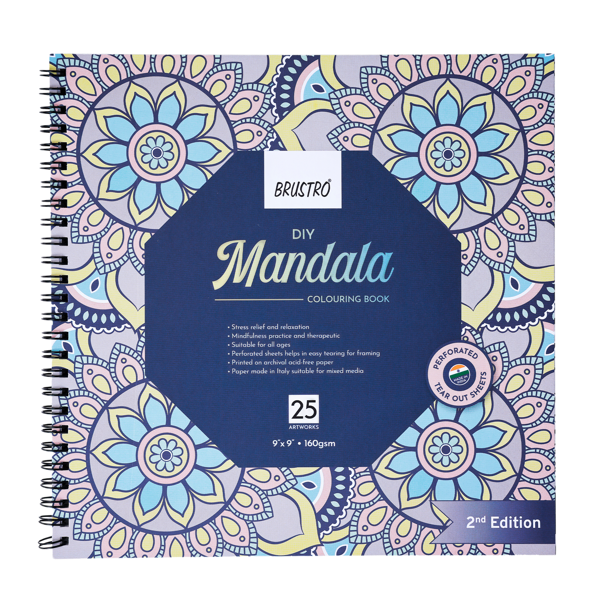 Brustro DIY Mandala Colouring Book–2nd Edition| 25 Designs,160 GSM Paper,9x9 inch,Tear-Out Sheets | Ideal for Stress Relief & Mindfulness Art Book for Adults & Kids,Drawing,Mixed Media,Pens,Markers