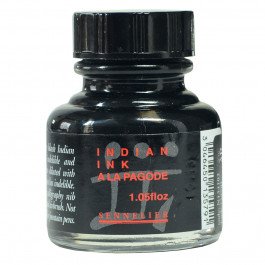 Sennelier inks, which are likened to Indian inks, are available in a selection of colours. Extremely rich, these inks are manufactured with shellac gum giving (to each shade) unique brilliance, brightness and vibration under light. They can be applied with a brush or ink pen and give a satin to brilliant film depending on thickness. They dry rapidly and display a high degree of water resistance, without being indelible. These inks are highly sought after for calligraphy, quill drawings, washes, for textile creations and materials research. They can be protected with a pencil fixative in order to increase their light stability. Available in 30ml and 250ml.