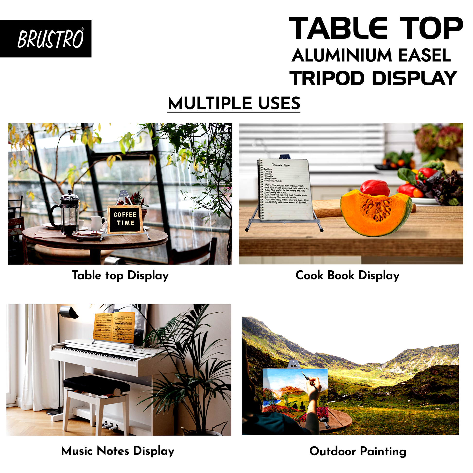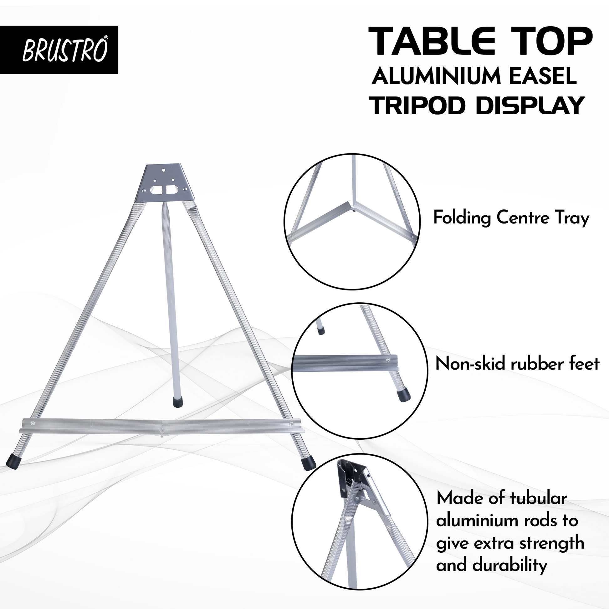 The Brustro Aluminium Table Top Tripod Easel is a premium quality, lightweight and portable display easel. Standing 16.7" tall, it features a collapsible aluminum frame that unfolds instantly, weighing only 0.21 kg. This versatile easel is perfect for displaying artwork, framed photos, books, presentations, and more, making it ideal for use in retail stores, trade shows, offices, classrooms, and homes. It securely holds items and offers extra stability with its non-skid rubber feet, protecting tabletop surfaces from scratches while providing a sturdy display solution.