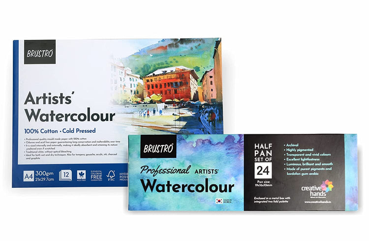 - Brustro Professional watercolour half pan set is a collection of 24 brilliant, vibrant and lightfast colours that have a high pigment load. They are intermixable to create a never ending colour palette.