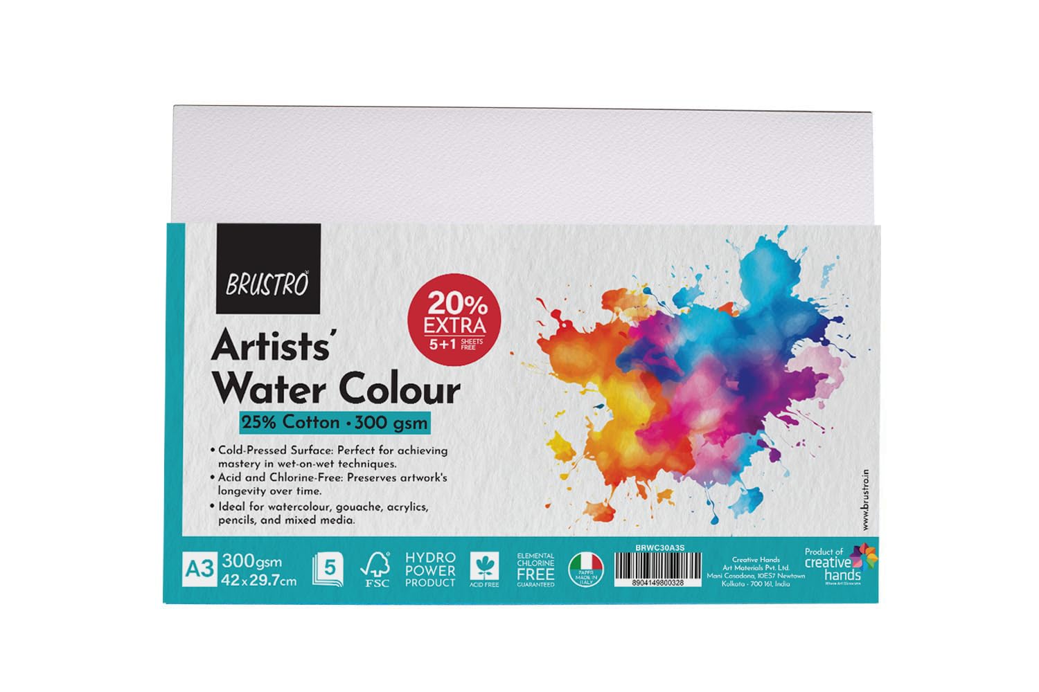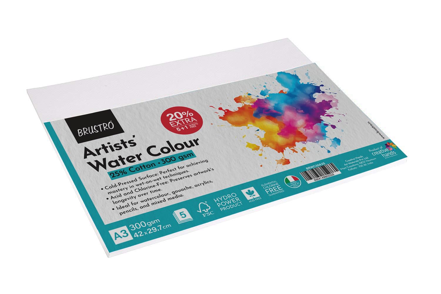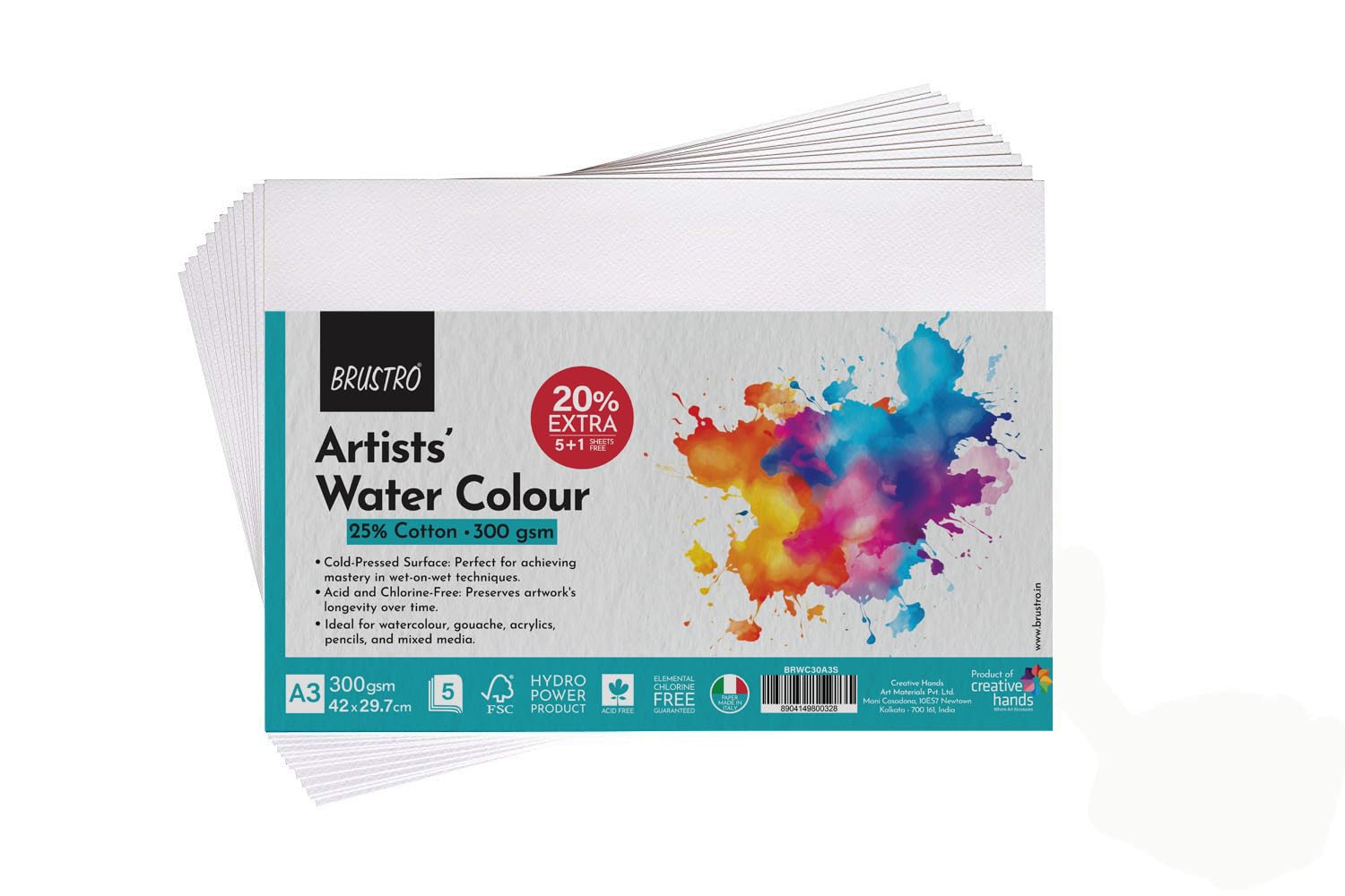 - Brustro Artists Watercolour Paper, 300 GSM, A3 - 25% Cotton, Cold Pressed, 5+1 Sheet
