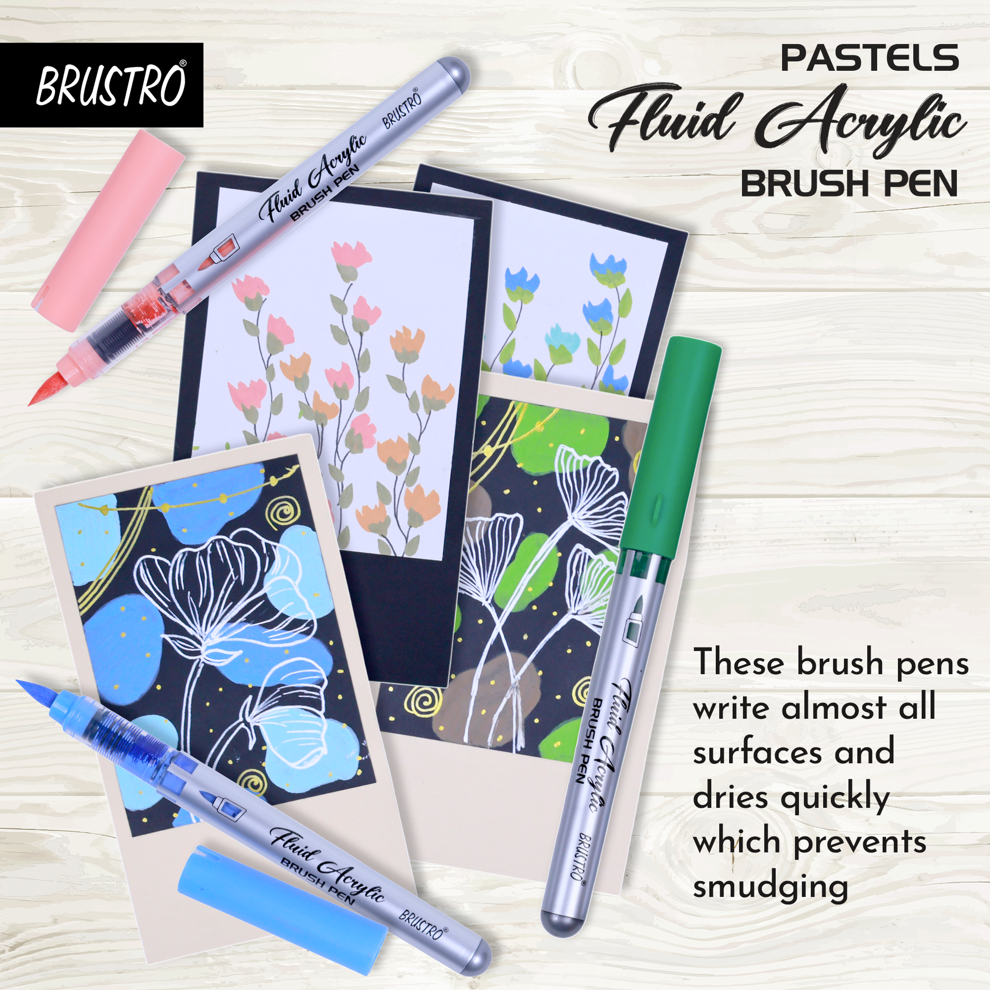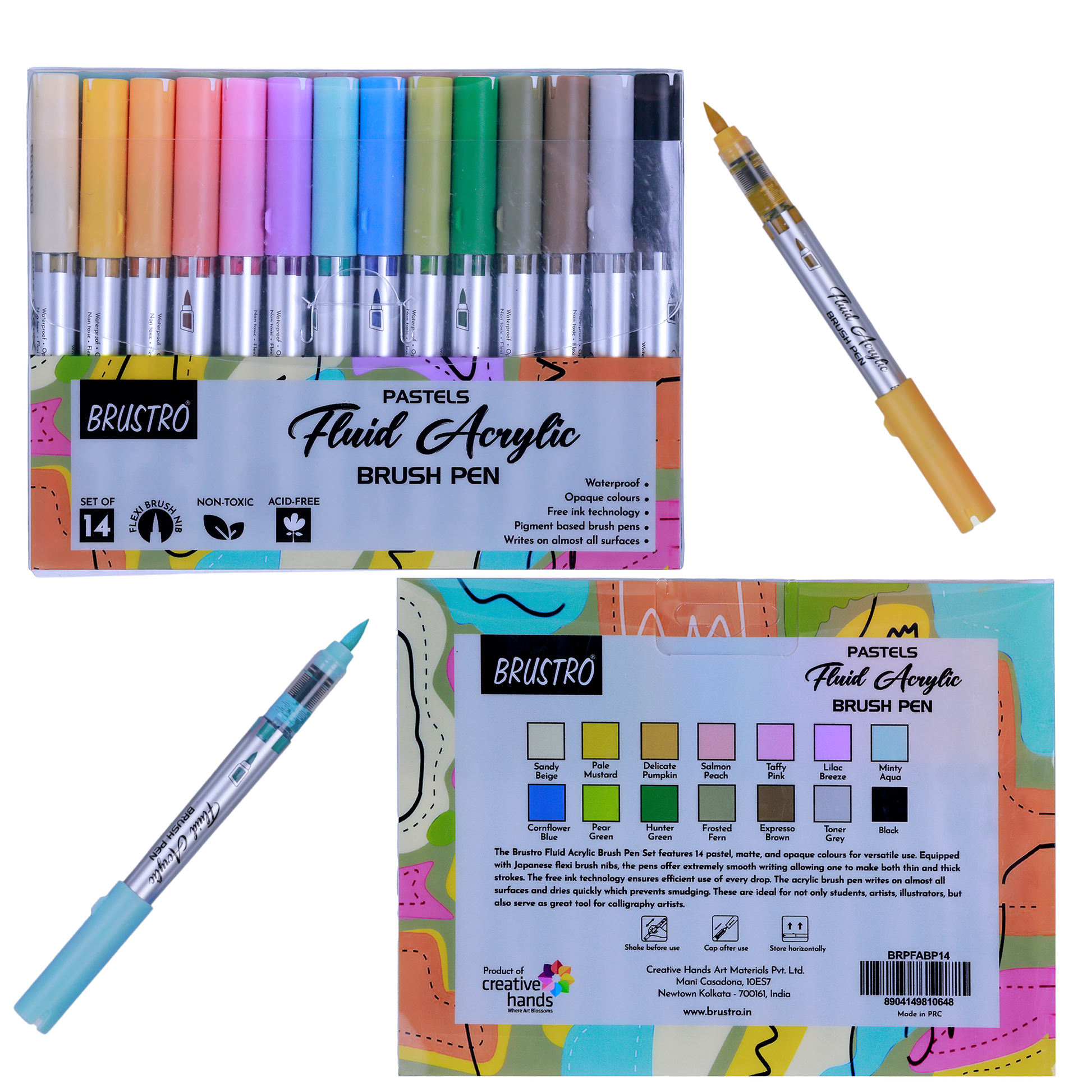 Indulge in soft, dreamy pastel tones with the Brustro Pastels Fluid Acrylic Brush Pen Set – designed for artists who love effortless expression and beautiful opacity. Each pen features premium Japanese flexi brush nibs that deliver smooth, controlled strokes, which is ideal for calligraphy, brush lettering, journaling, illustrations and craft décor. Packed with pigment-rich, waterproof acrylic ink, these brush pens provide vibrant yet matte pastel coverage on almost any surface - paper, canvas, wood, metal, plastic, glass & more. The Free-Ink technology ensures a consistent flow and efficient ink usage, while fast-drying properties prevent smudges, making them perfect for both beginners and professionals. Create endlessly with 14 versatile shades including Sandy Beige, Pole Mustard, Delicate Pumpkin, Salmon Peach, Taffy Pink, Lilac Breeze, Minty Aqua, Cornflower Blue, Pear Green, Hunter Green, Frosted Fern, Expresso Brown, Toner Grey & Black. Bring your ideas to life with soft hues and bold creativity, where every stroke feels like art.