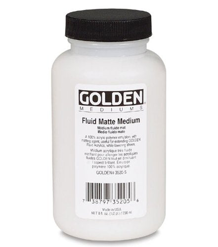 Fluid Matte Medium is useful for extending colors, decreasing gloss and increasing film integrity. Particularly useful with GOLDEN Fluid Acrylics to decrease gloss while maintaining consistency.
