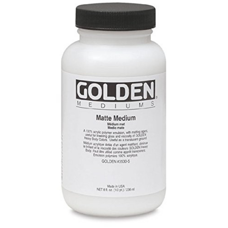 Matte Medium is a pourable medium useful for extending color, decreasing gloss and increasing film integrity. It is also used as a nearly clear ground on canvas instead of gesso.
