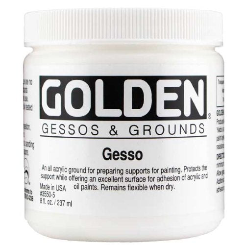 Gesso can be thought of as the bridge between your support (canvas, board or whatever you paint on) and the paint. GOLDEN Gesso is designed to penetrate supports and provide a surface to which paint can adhere. Proper preparation with GOLDEN Gesso increases the life span of artwork. Our Gesso is formulated to be flexible and is highly pigmented for greater opacity.