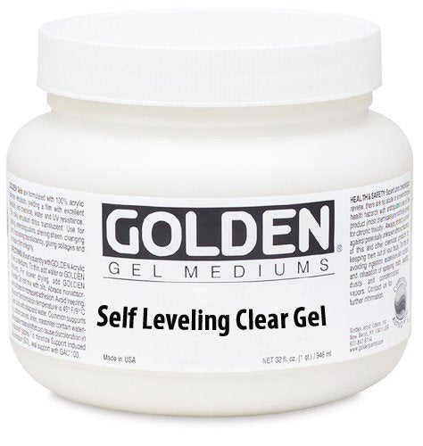 Clear Leveling Gel formerly Self Leveling Clear Gel produces an even film with excellent clarity. It has a unique resinous, stringy consistency resulting from its leveling property. Clear Leveling gel dries to a flexible, high gloss film while imparting a leveling quality to other GOLDEN Acrylic products. It blends well with GOLDEN Acrylic colors to produce glazes.