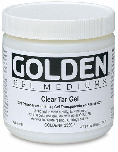 Clear Tar Gel has a pully, tar-like feel, but in a clear, colorless gel. This extremely resinous and stringy consistency makes it feel very different from other acrylic gels. Useful for generating fine detailed lines by “dripping” it over surfaces, as it continuously flows from palette knives or other tools. It blends well with all GOLDEN Acrylic colors, although Fluid Colors work best.