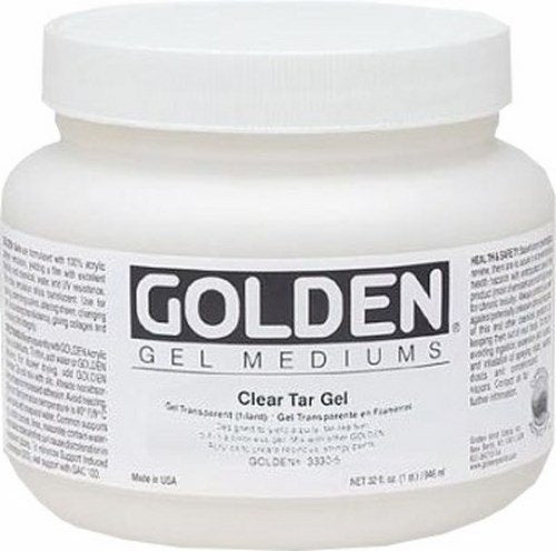 Clear Tar Gel has a pully, tar-like feel, but in a clear, colorless gel. This extremely resinous and stringy consistency makes it feel very different from other acrylic gels. Useful for generating fine detailed lines by “dripping” it over surfaces, as it continuously flows from palette knives or other tools. It blends well with all GOLDEN Acrylic colors, although Fluid Colors work best.