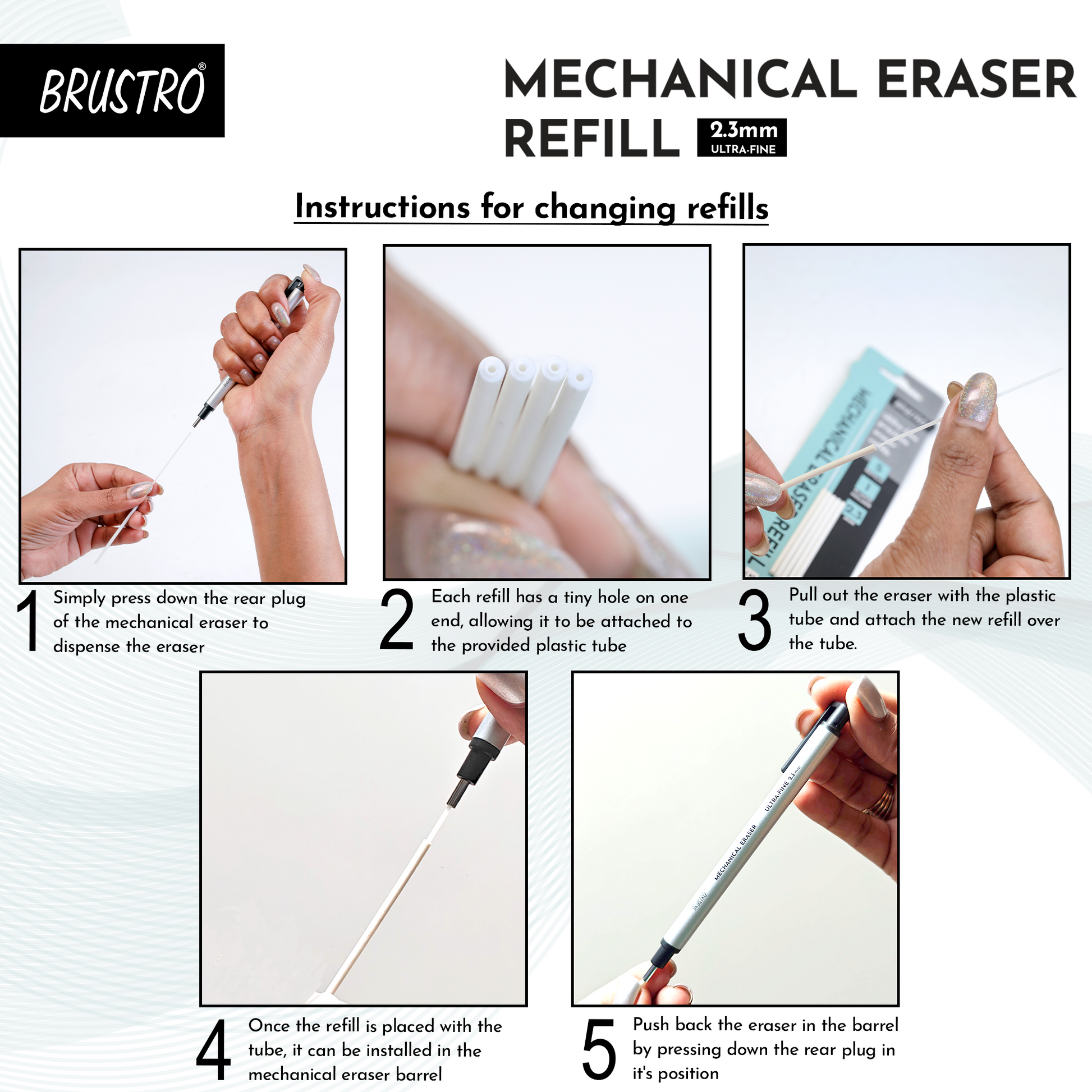 - Simply press down the rear plug of the mechanical eraser to dispense the eraser, pull out the eraser with the plastic tube and attach the new refill over the tube. Push back the eraser in the barrel by pressing down the rear plug in it's position.